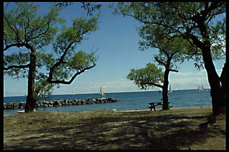 It is one of the five great lakes. Toronto lies at the northern shore of Lake Ontario. The Toronto Islands are just in front of the downtown. There the Torontonians love to spend their weekend.