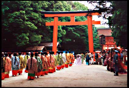 The procession heads to Shimogamo-jinja Shrine, where ceremonies take place.